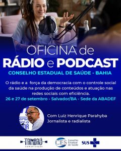 Durante dois dias o Conselho Estadual de Saúde da Bahia, realizou uma OFICINA DE RÁDIO E PODCAST, para capacitar comunicadores populares na capital baiana. A oficina foi facilitada pelo jornalista Luiz Henrique Parahyba. O presidente do CES-BA, Marcos Gêmeos, também participante da Oficina, afirmou que o resultado será uma produção semanal de conteúdos para o rádio, realizado pela equipe de comunicadores do SUS.